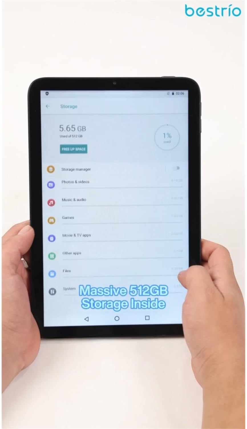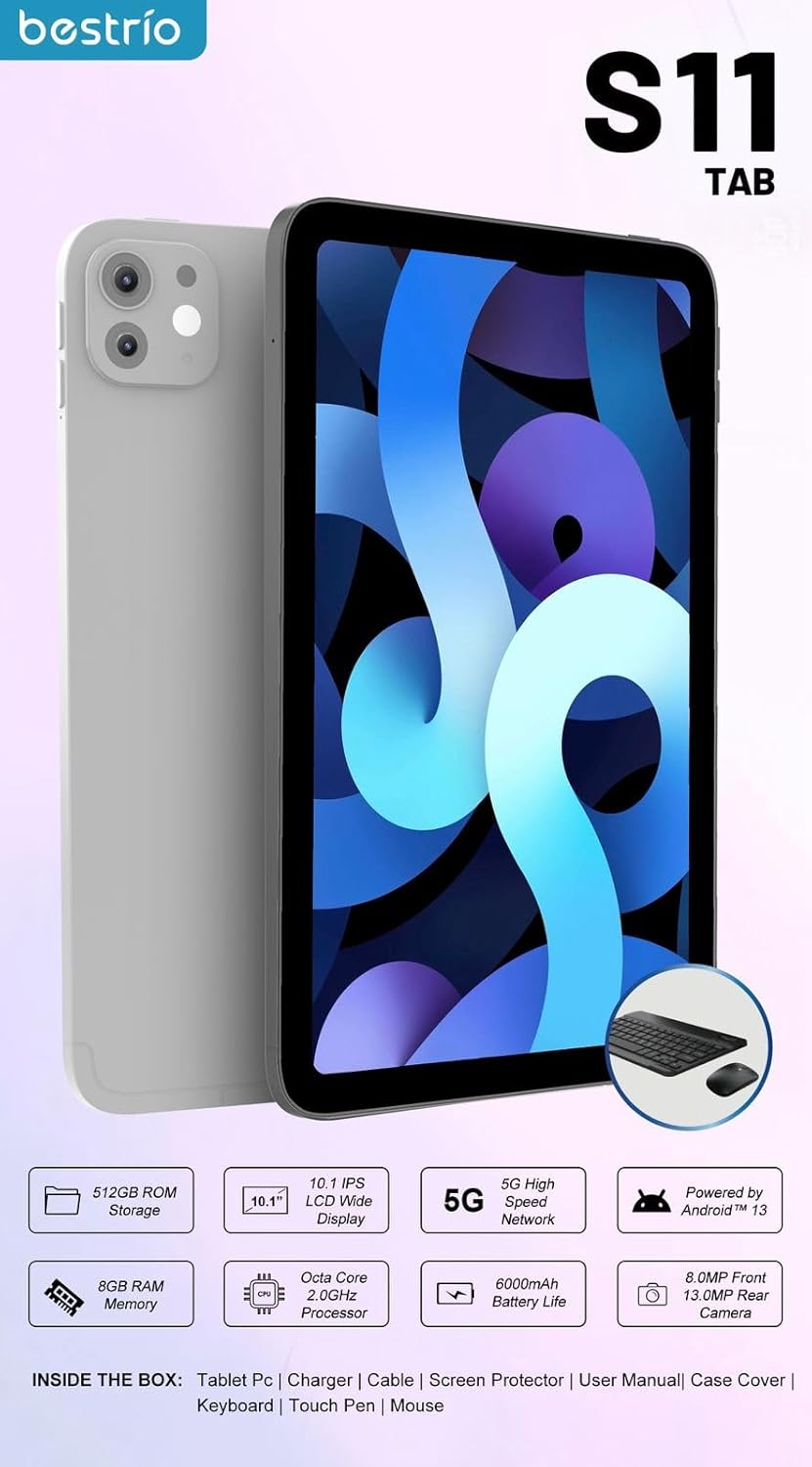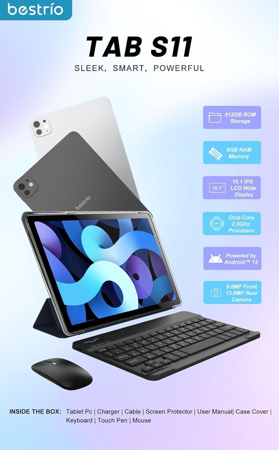 Bestrio S11 është një tablet i madh dhe funksional, i dizajnuar për përdorim të përditshëm, mësim online dhe argëtim multimedial. Me 8GB RAM dhe 512GB memorie të brendshme, ky model ofron hapësirë të bollshme dhe funksionim të qëndrueshëm për aplikacione, video, dokumente dhe përmbajtje edukative.