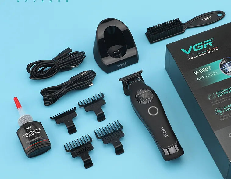 VGR V-880T është makinë rroje profesionale për flokë dhe mjekër, e ndërtuar për prerje të qëndrueshme dhe të saktë. Pajisja përdor tehe çeliku inox me precizion të lartë, të dizajnuara për prerje uniforme pa tërheqje të flokut. Falë motorit të fuqishëm dhe trupit ergonomik, është e përshtatshme si për përdorim shtëpiak ashtu edhe për sallone berberësh.