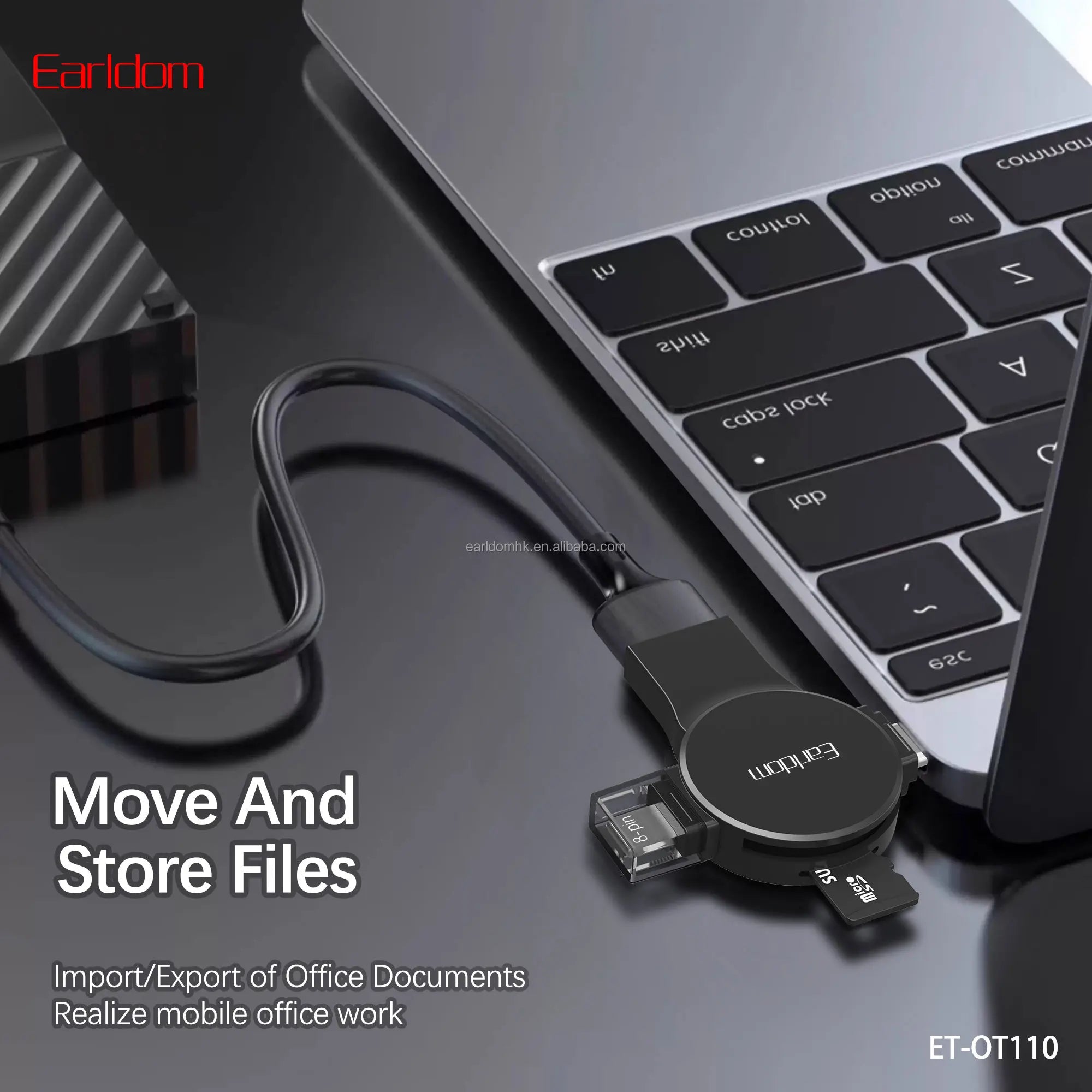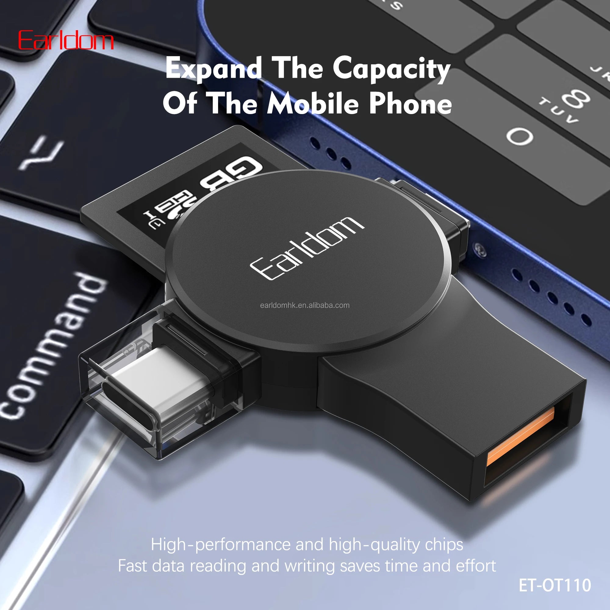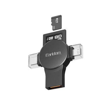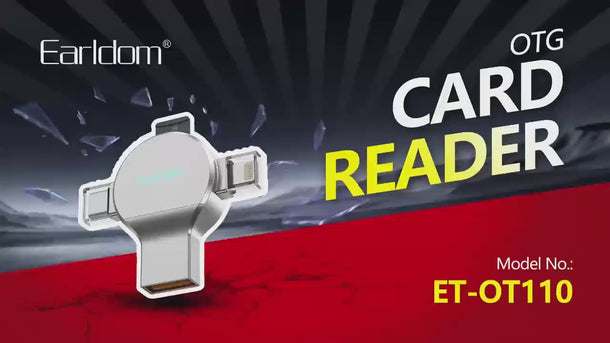 Earldom ET-OT110 është një lexues kartelash multifunksional 4-në-1 i dizajnuar për transferim të shpejtë të të dhënave midis pajisjeve të ndryshme. Pajisja mbështet lidhje përmes USB-A, USB Type-C, Lightning dhe USB-A, duke e bërë të përshtatshme për telefona, tabletë dhe laptopë të ndryshëm.